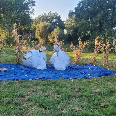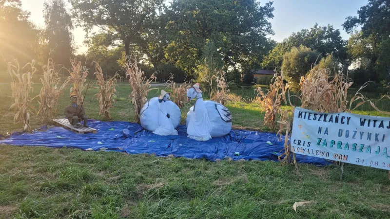 Odkryj witacz dożynkowy "Chełmoniec" w gminie Kowalewo Pomorskie, ozdobiony symbolami rolnictwa.