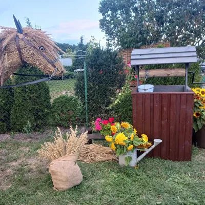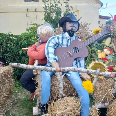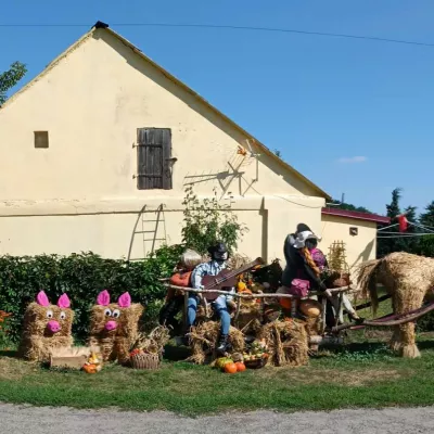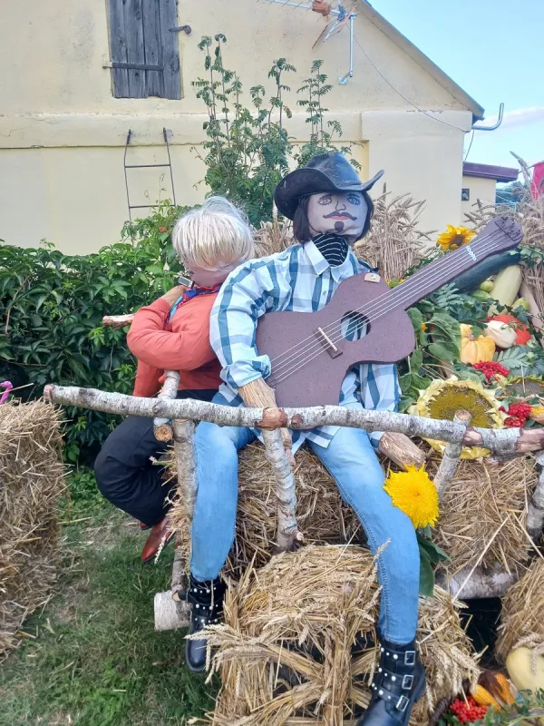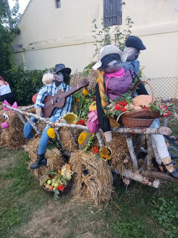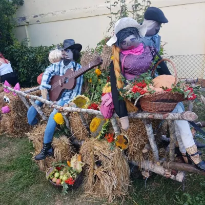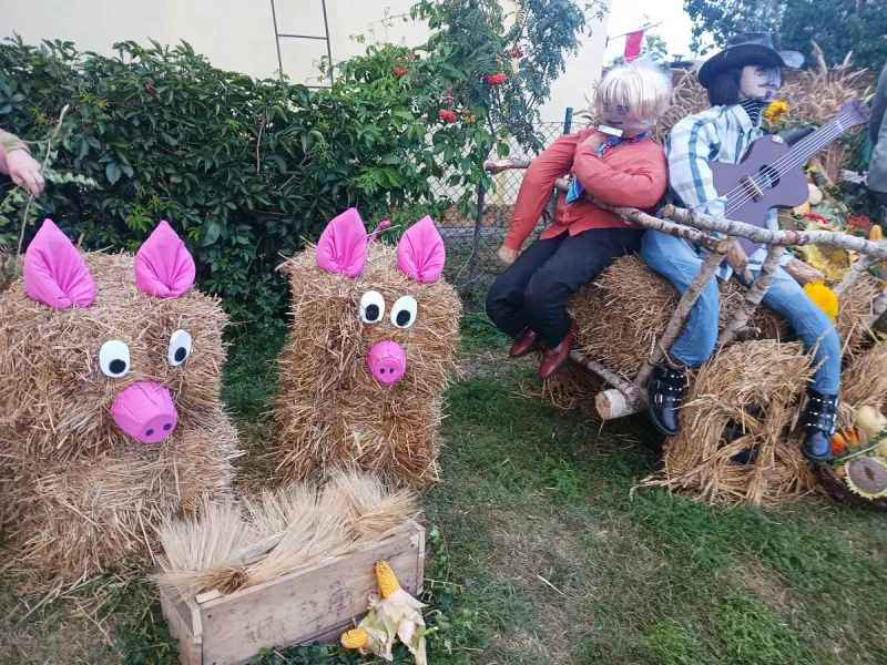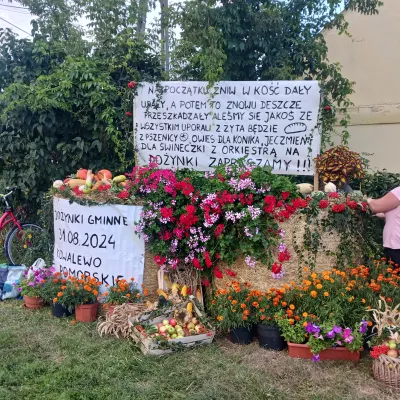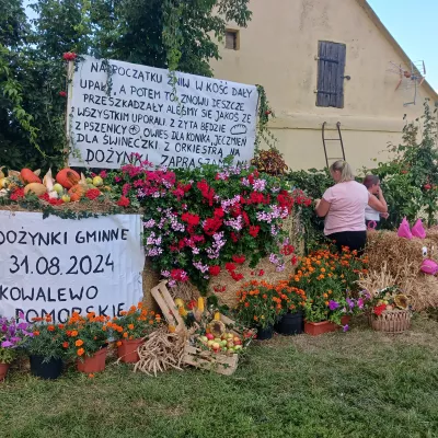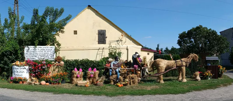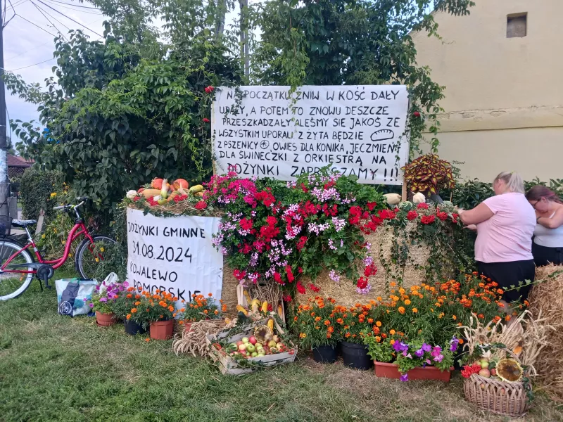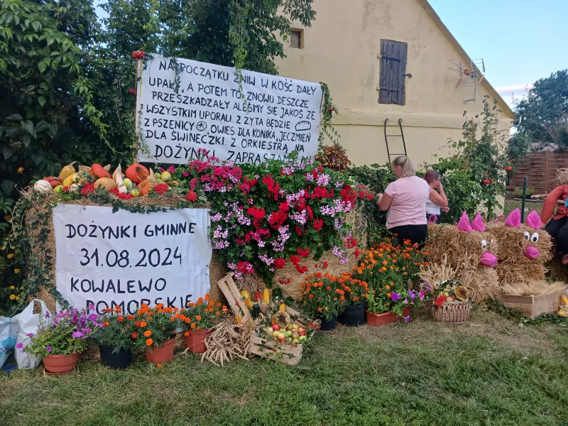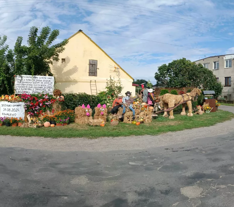Odkryj witacz dożynkowy "Piątkowo" w gminie Kowalewo Pomorskie, ozdobiony symbolami rolnictwa.